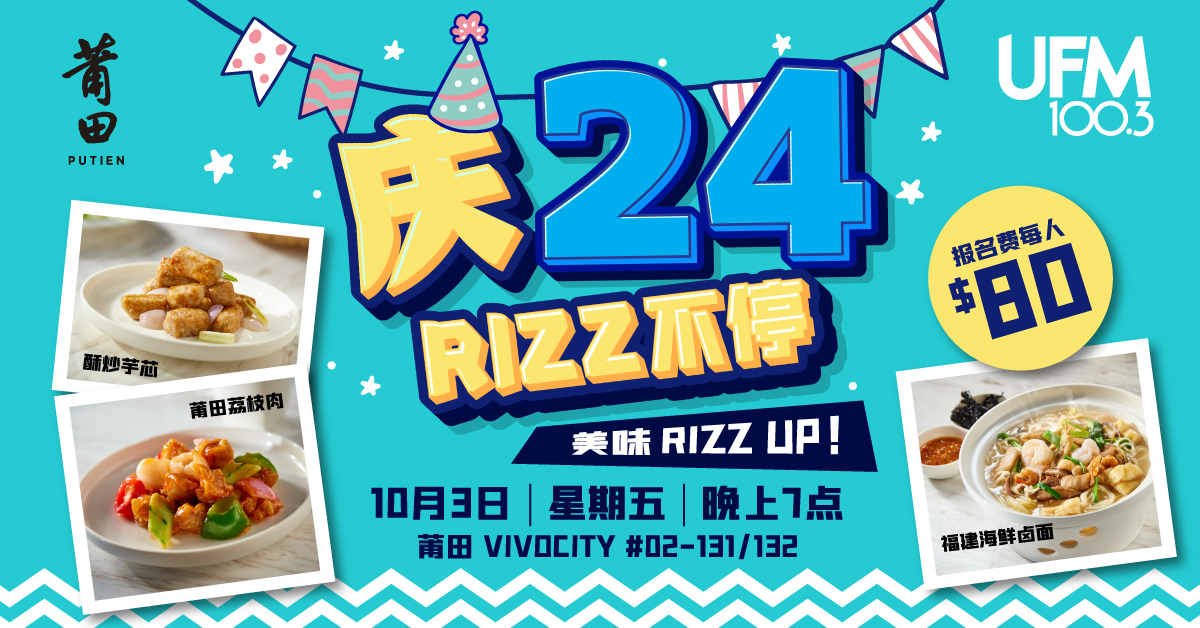 UFM100.3 庆24,美味 RIZZ UP! 日期:10月3号 (星期五) 时间:晚上7点 地点:莆田 VIVOCITY #02-131/132 报名费:每人$80 Whatsapp “Putien、你的名字、报名人数(最多4人)、电邮” 到8855 1003。 报名成功者将获得通知。 --------------------------------------------------- 菜单包括: 小菜 虾苗拌头水紫菜 家乡焖笋干 咸香黄花鱼 肉类 黄金荷叶包 莆田荔枝肉 椒盐猪手 海鲜 上汤焗生虾 盐焗黄花鱼...